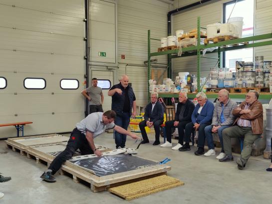 Ein zentrales Thema der Cheftage war die Verarbeitung von dünnschichtigem Estrich auf Zementbasis – ein System, das sich besonders für Sanierungen mit geringen Aufbauhöhen eignet. In einer Live-Vorführung vor Ort auf dem Betriebsgelände der Firma Ernst-Werner Meschenmoser Fußbodentechnik GmbH bekamen die Teilnehmer eindrucksvolle Einblicke in die Verarbeitung und die technischen Möglichkeiten dieser Estrichform. Passend dazu folgte ein vertiefender Fachvortrag von Udo Zahn, Saint-Gobain Weber, einem Fördermitglied des QV-Fußboden am nächsten Tag. Unter dem Titel „Nachrüstung von Fußbodenheizungen im Bestand“ wurden Varianten dünnschichtiger Systeme, Herausforderungen bei normgerechter Verarbeitung sowie Chancen für den Bodenleger praxisnah aufgezeigt. Die anschließende Podiumsdiskussion bot Raum für konkrete Nachfragen und den Erfahrungsaustausch mit anderen Herstellern, wie beispielsweise von der Glass AG.